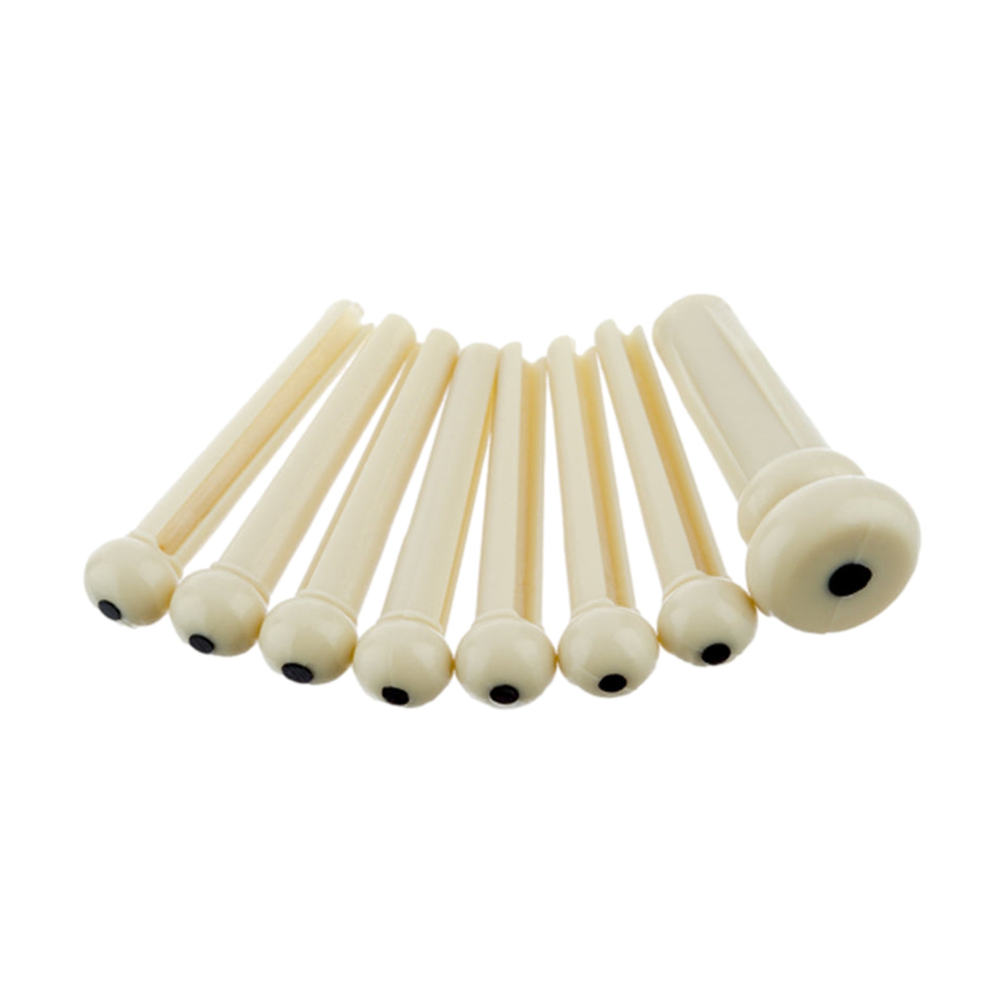 Set of seven bridge pins for use with most Fender acoustic guitars. Includes extra bridge pin and matching strap end pin. Available in ivory with black dots and black with white dots.