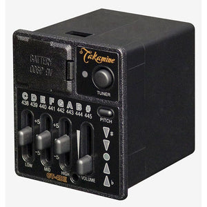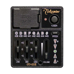 The CT4B II consists of 3 bands of graphic EQ tone control, a volume control slider and a built-in chromatic tuner. The 3 band EQ provides control over the bass (LOW), midrange (MID) and treble (HIGH) frequency response. With the sliders set at the midpoint (0) the electric signal from the guitar is evenly balanced across the frequency range. The desired tone is then dialed in by using the sliders to add or subtract frequency response as desired. Each frequency control slider will raise or lower the band response by +/-5db. The volume slider adjusts the output volume of the preamp.