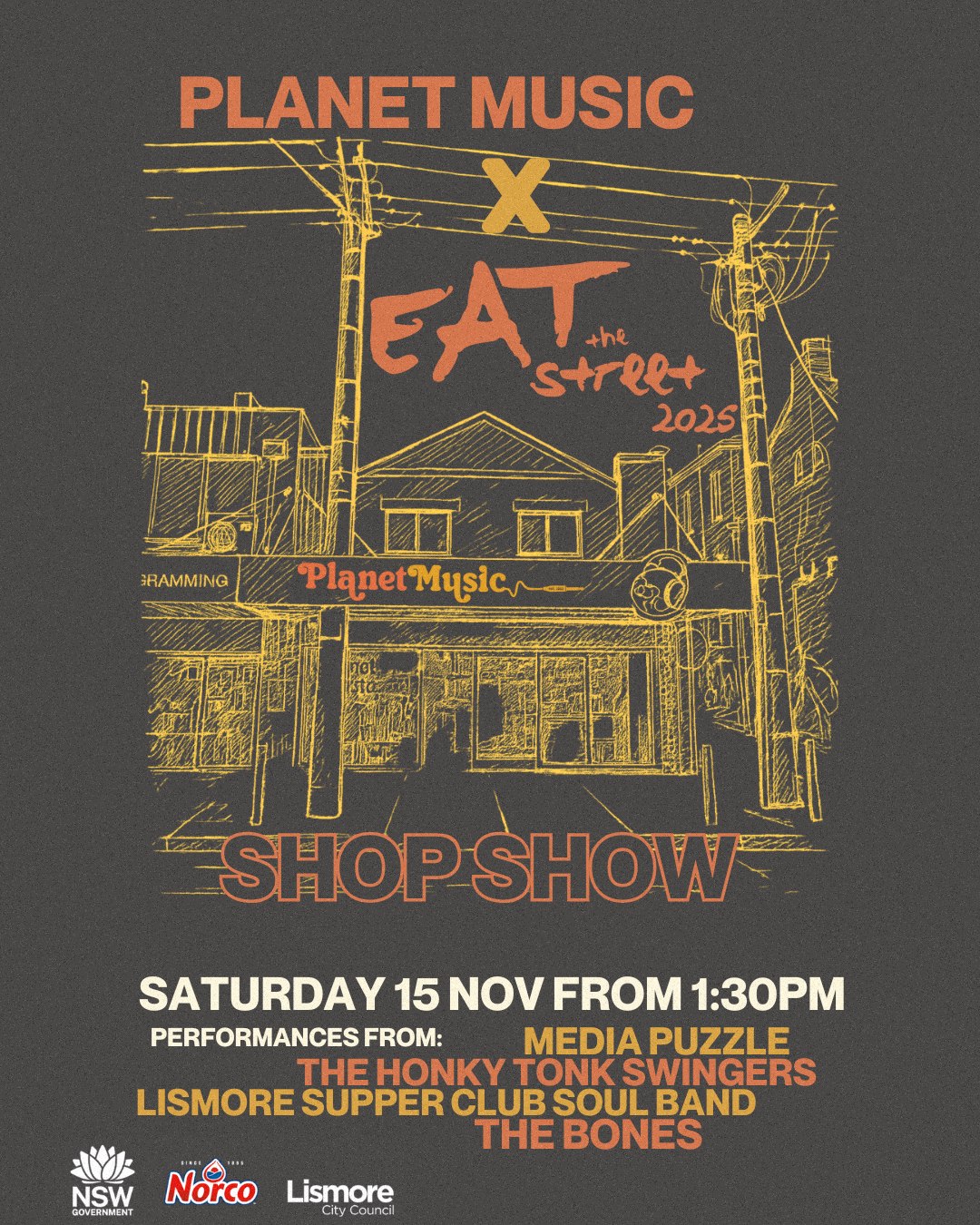 Catch the Planet Music Shop Show at Eat The Street Lismore on November 15th! Four local bands hit the stage from 1:30PM, bringing live music, great vibes, and community spirit to the heart of Lismore. Don’t miss this celebration of local talent and music culture!